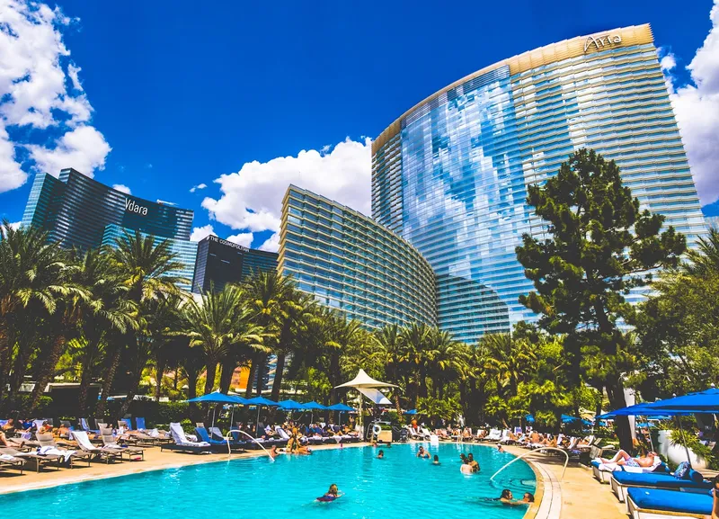 The Aria pool area feels polished and grown-up, with clean modern lines and a crowd that tends to skew quieter than the big party resorts. You get multiple pools spread out in a way that avoids the usual Vegas crush, though chairs fill up early on busy weekends. Service is solid and the environment is calm, which some people love and others find a little sleepy. It works best if you want comfort and shade rather than a loud dayclub scene.